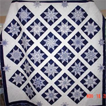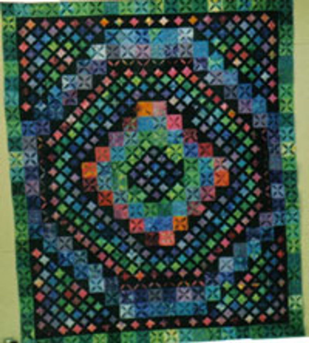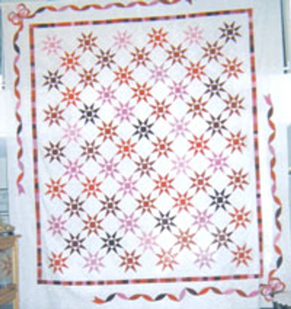 Cathedral Windows quilt. Done the old way and very heavy. Members contributed the individual pieces that make up the window, then sewed together.