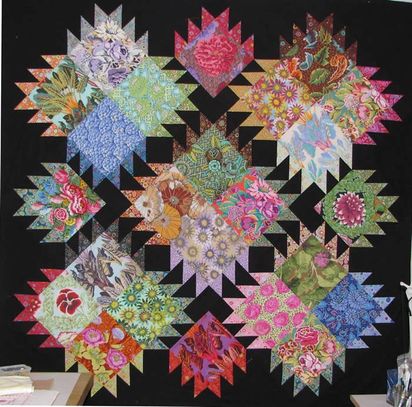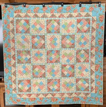 This quilt included 36 blocks done by the members of the guild. Included in them are pieced patterns that were used with permission of designer Linda Hibbert. Borders designed by Patti Voyles, who assembled the top. Machine quilting done by Sue Handley