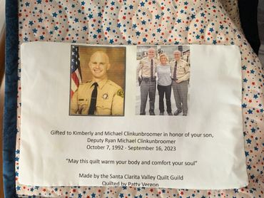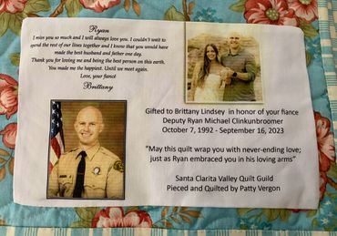 Sargent Owen lost his life in the line of duty in 2016. Quilt made in his honor and given to his wife in 2017