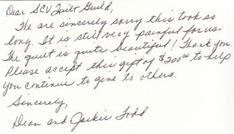 We have a very active and productive community service side to our guild opportunities. The members of the committee and our membership support many different types of organizations. We have had wonderful support from our membership in supplying The Painted Turtle Camp with several requested items such as: